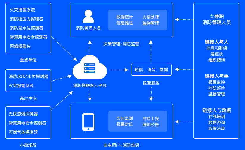 1.感知层:通过物联网技术,联网业主用户根据本单位消防设备配置实际情况,在原有的火灾自动报警系统的基础上,加装智慧用电安全探测器、智慧消防水源采集器、智慧消防标签、网络视频摄像头、独立式感烟探测器等前端物联探测设备实现对火灾隐患、消防设施、人员等信息的实时感知和采集。